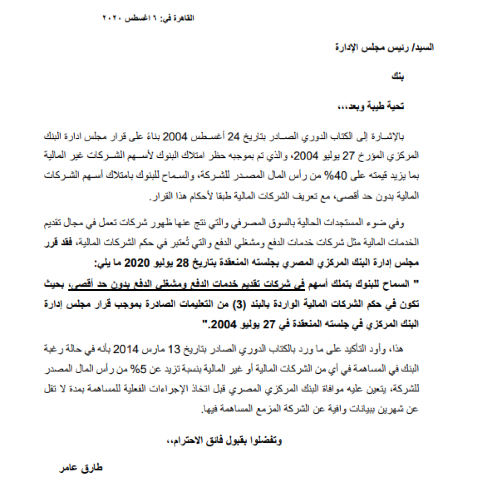 قرر البنك المركزي المصري، السماح للبنوك العاملة في السوق المحلية بتملك أسهم في شركات تقديم خدمات الدفع ومشغلي الدفع الإلكتروني بدون حد أقصى.