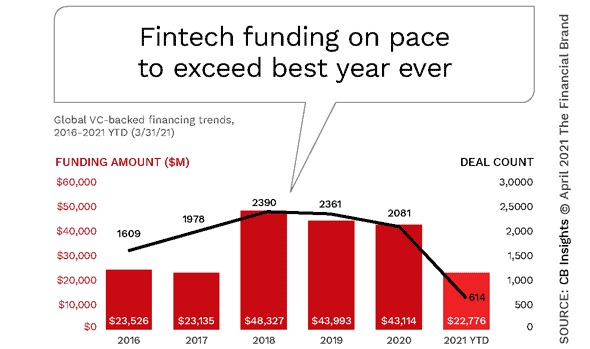نجحت شركات التكنولوجيا المالية عبر العالم في جمع أكثر من 22.8 مليار دولار من خلال 614 صفقة وذلك وفقا لتقرير ” حالة التكنولوجيا المالية في الربع الأول من عام 2021 الذي أعدته شركة سي بي إنسايتس العالمية المتخصصة في مجال بحوث السوق في العالم.