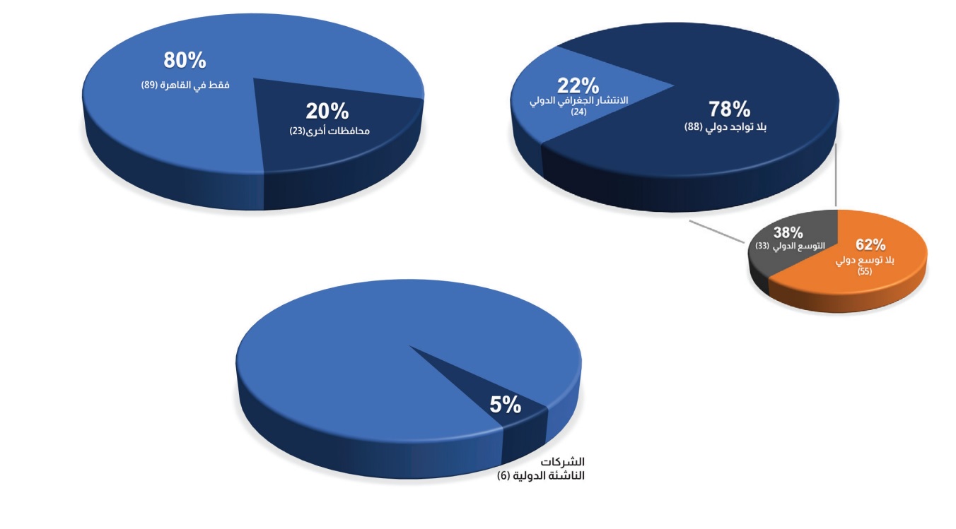 وفيما يتعلق بالانتشار الجغرافي للشركات الناشئة عالميًا، قامت 24 شركة من الشركات الناشئة التي شملتها الدراسة بالتوسع عل الصعيدين الإقليمي والدولي، وأصبحت تحظى بتواجد ملحوظ على مستوى منطقة الشرق الأوسط وشمال أفريقيا ودول مجلس التعاون الخليجي وأوروبا، وأبدت 33 شركة ناشئة تخطيطها للتوسع الدولي خلال الإثني عشر شهرًا المقبلة مع التركيز بشكل كبير على منطقتي الشرق الأوسط وشمال أفريقيا.