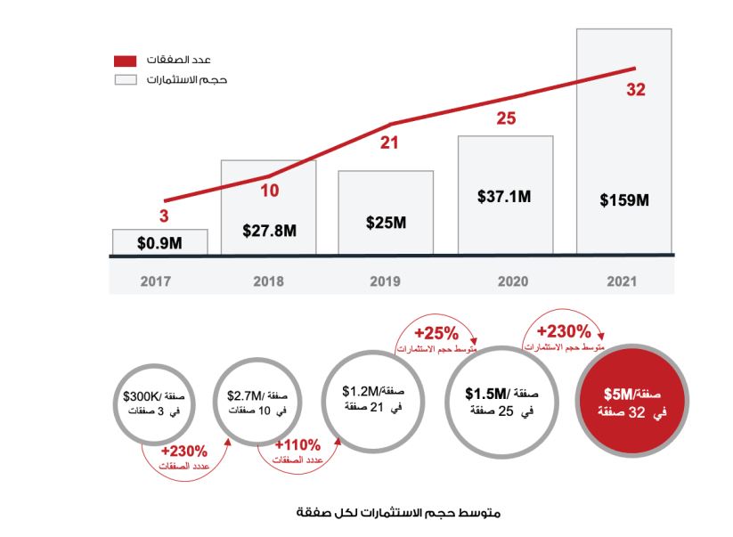 وأعلن التقرير عن التطور الضخم في استثمارات التكنولوجيا المالية على مدار الخمس سنوات الماضية، حيث تم ضخ ما يقرب من 250 مليون دولار في سوق الشركات الناشئة المصرية العاملة في مجال التكنولوجيا المالية والقطاعات المغذية لها، وارتفع حجم الاستثمارات في عام 2021 إلى 159 مليون دولار مقابل 900 ألف دولار في عام 2017، كما ارتفع إجمالي عدد الصفقات إلى أكثر من 30 صفقة في عام 2021 مقارنة ب3 صفقات في عام 2017.