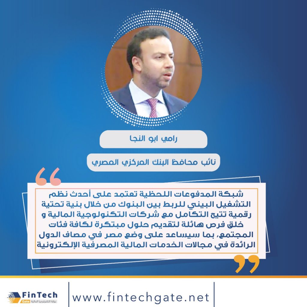 وأشار رامي أبو النجا – نائب محافظ البنك المركزي إلى أن ” شبكة المدفوعات اللحظية تعتمد على أحدث نظم التشغيل البيني للربط بين البنوك من خلال بنية تحتية رقمية تتيح التكامل مع شركات التكنولوجية المالية وخلق فرص هائلة لتقديم حلول مبتكرة لكافة فئات المجتمع، بما سيساعد على وضع مصر في مصاف الدول الرائدة في مجالات الخدمات المالية المصرفية الإلكترونية”.