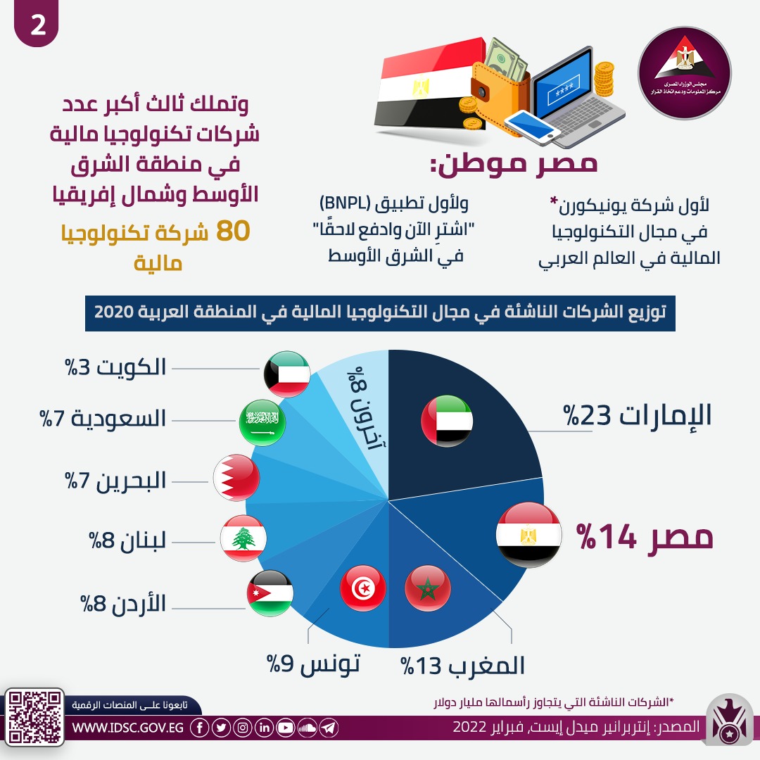 كما تعد مصر موطنًا لأول شركة يونيكورن في مجال التكنولوجيا المالية في العالم العربي وأول تطبيق (BNPL) “اشترِ الآن وادفع لاحقًا” في الشرق الأوسط. وتملك 80 شركة تكنولوجيا مالية وهو ثالث أكبر عدد شركات تكنولوجيا مالية في منطقة الشرق الأوسط وشمال إفريقيا.