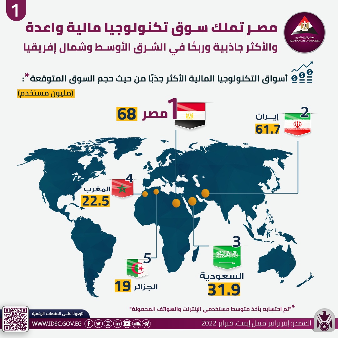 نشر مركز المعلومات ودعم اتخاذ القرار بمجلس الوزراء المصري إنفوجرافيك جديدًا بعنوان “مصر تملك سوق تكنولوجيا مالية واعدة والأكثر جاذبية وربحًا في الشرق الأوسط وشمال إفريقيا” يرصد فيه وضع مصر في مجال التكنولوجيا المالية على مستوى دول الشرق الأوسط وشمال إفريقيا.