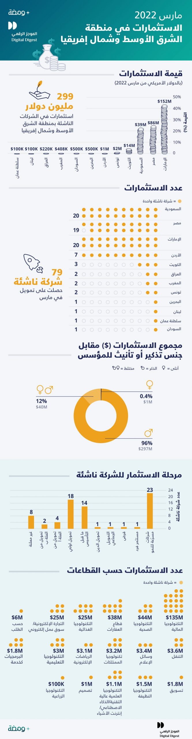 حصلت الشركات الناشئة في منطقة الشرق الأوسط وشمال إفريقيا (MENA) على تمويل بقيمة 299 مليون دولار أمريكي في 79 صفقة في مارس 2022، بانخفاض نسبته 22% مقارنةً بالشهر الماضي، وبارتفاع نسبته 71% مقارنةً بالعام الماضي، ليصل إجمالي قيمة التمويل في الربع الأول من عام 2022 إلى 934 مليون دولار بزيادة تبلغ 38% مقارنةً بنفس الفترة من العام الماضي.
