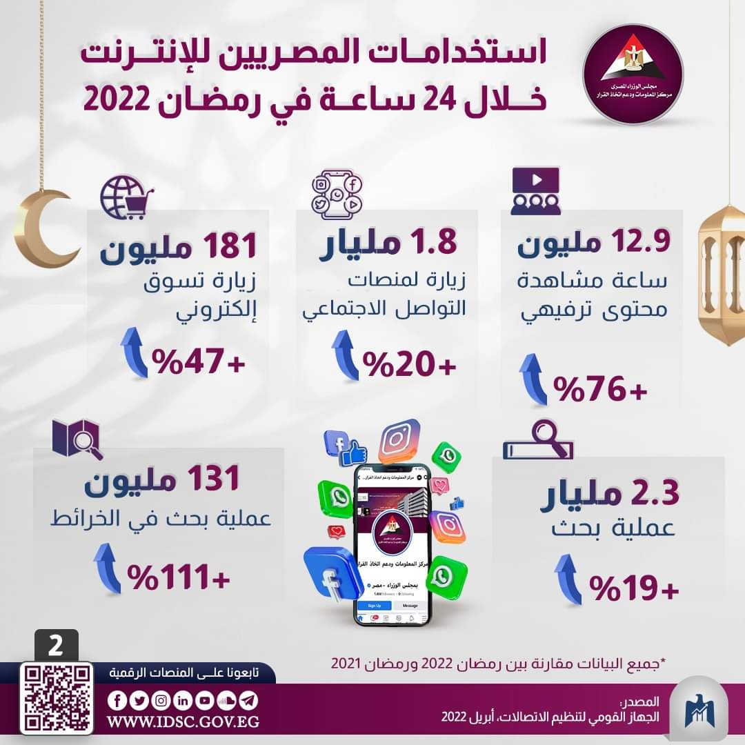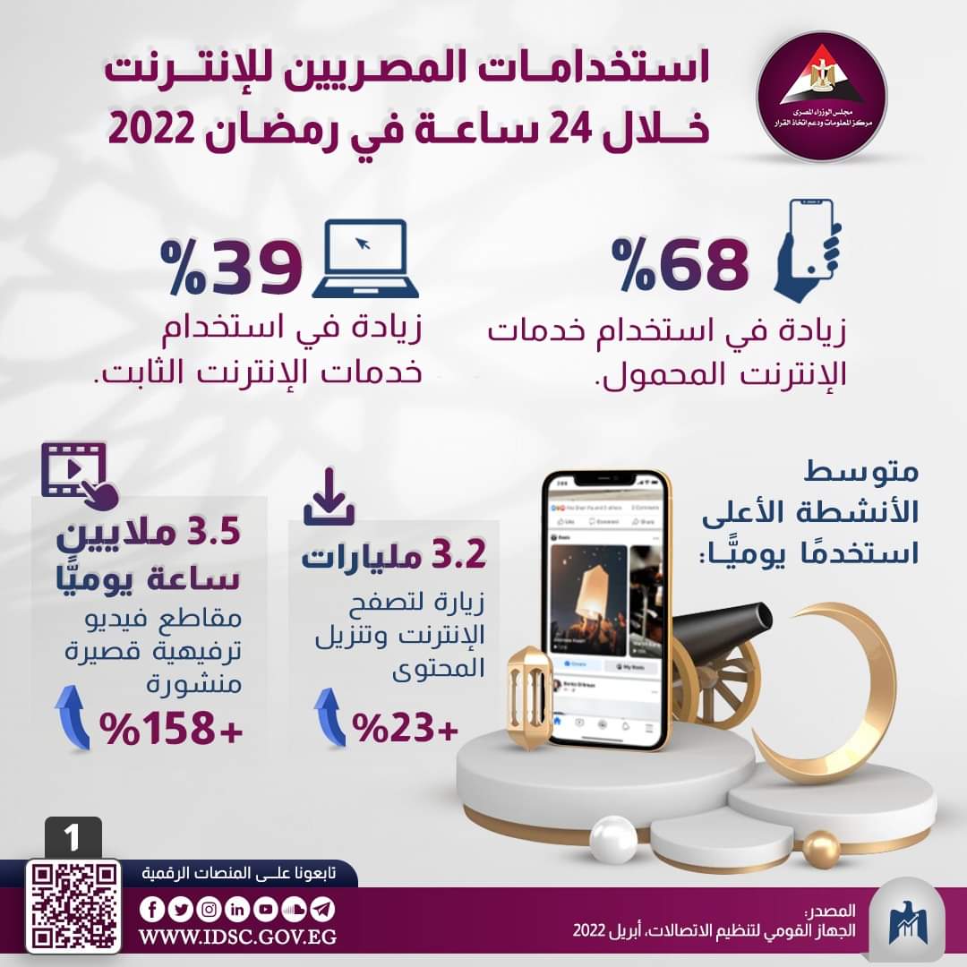 رصد مركز المعلومات ودعم اتخاذ القرار بمجلس الوزراء تقريرا عن الجهاز القومي لتنظيم الاتصالات يتتبع خلاله استخدامات المصريين للانترنت خلال 24 ساعة في رمضان 2022،ومقارنتها بالفترة نفسها في رمضان 2021 تبين زيادة في استخدام المصريين لخدمات الإنترنت المحمول بنسبة 68% في ظل ارتفاع عدد مستخدمي خدمات الانترنت .المحمول ليبلغ 11 مليون مستخدم