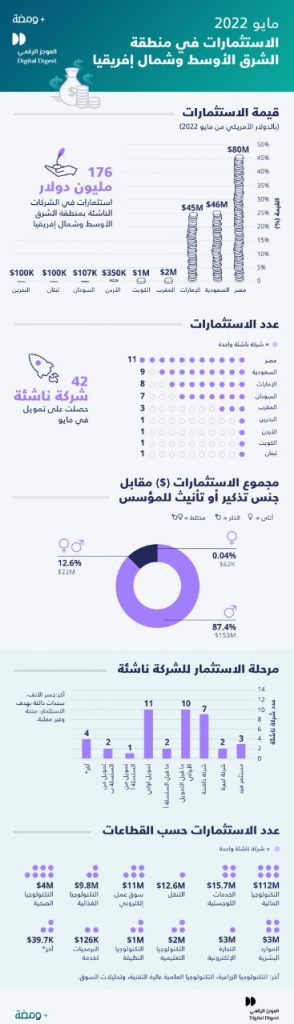 نجحت الشركات الناشئة في الشرق الأوسط وشمال إفريقيا في حصد 176 مليون دولار استثمارات في مايو 2022 من خلال 42 صفقة، ما يمثل انخفاضًا بنسبة 40% مقارنةً بالشهر الماضي ولكن بارتفاع نسبته 62.7% مقارنةً بالعام الماضي، وفقًا لتقرير نشره موقع ومضة.