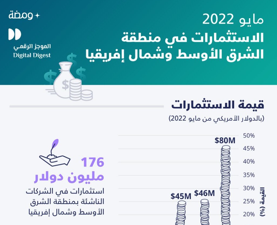 نجحت الشركات الناشئة في الشرق الأوسط وشمال إفريقيا في حصد 176 مليون دولار استثمارات في مايو 2022 من خلال 42 صفقة، ما يمثل انخفاضًا بنسبة 40% مقارنةً بالشهر الماضي ولكن بارتفاع نسبته 62.7% مقارنةً بالعام الماضي، وفقًا لتقرير نشره موقع ومضة.