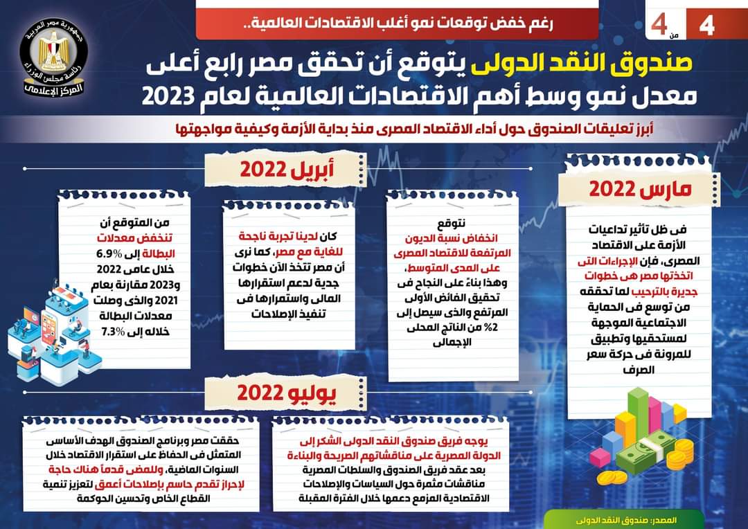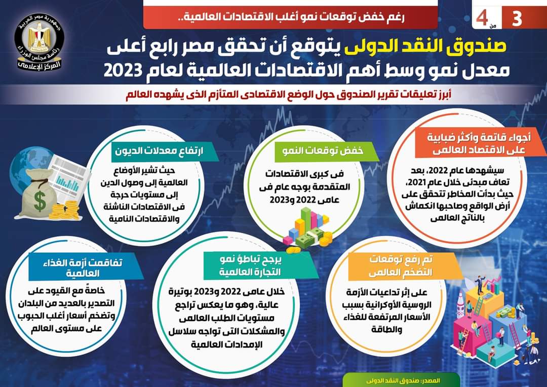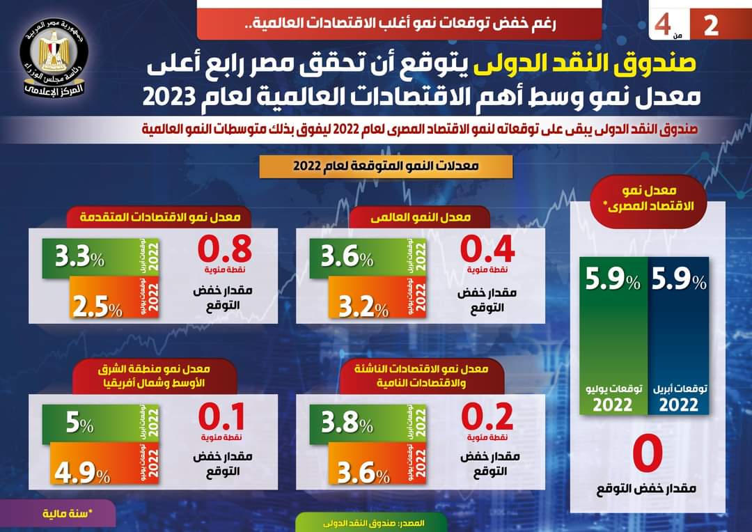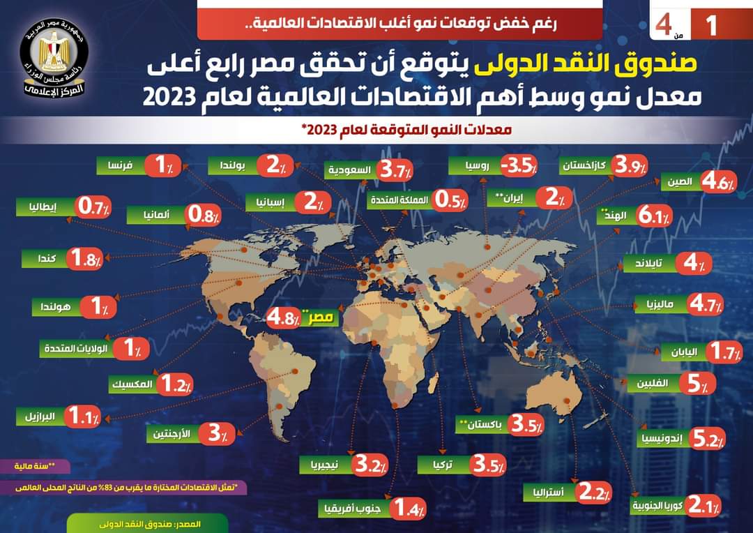 وفي هذا الصدد نشر المركز الإعلامي لمجلس الوزراء تقريراً تضمن إنفوجرافات تسلط الضوء على توقعات صندوق النقد الدولي بتحقيق مصر رابع أعلى معدل نمو وسط أهم الاقتصادات العالمية لعام 2023، وذلك على الرغم من خفض توقعات نمو أغلب الاقتصادات العالمية.