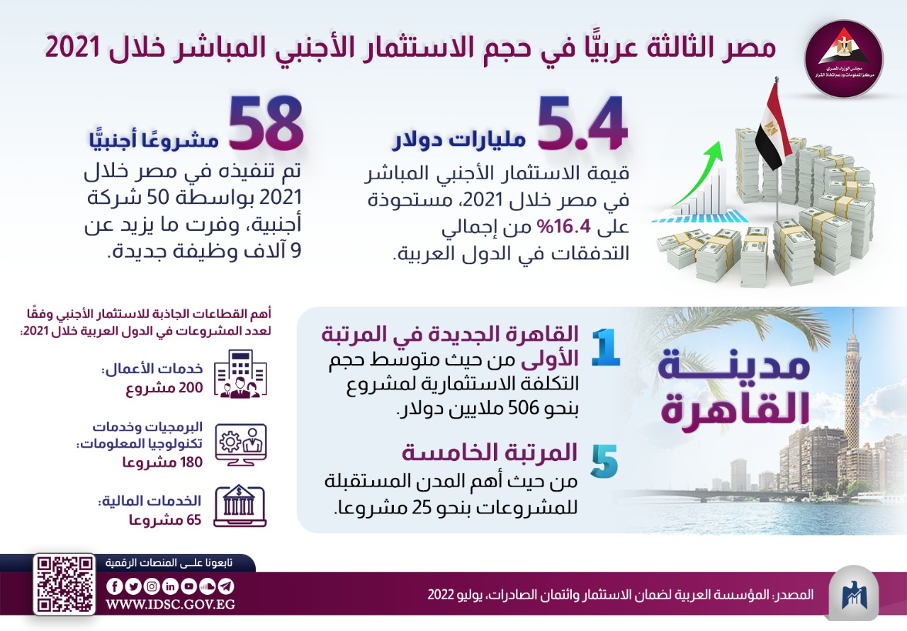 الصفحة الرئيسية أخبارمعلومات الوزراء: مصر الثالثة عربيًّا في حجم الاستثمار الأجنبي المباشر خلال 2021 بنحو 5.4 مليار دولار