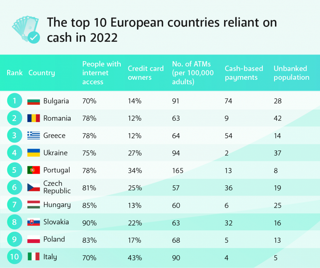 وجاء في المرتبة الثانية رومانيا، ثم اليونان فأوكرانيا، والبرتغال في المرتبة الخامسة من حيث أعلى الدول الأوروبية تداول للنقد على حساب التعاملات الإلكترونية.