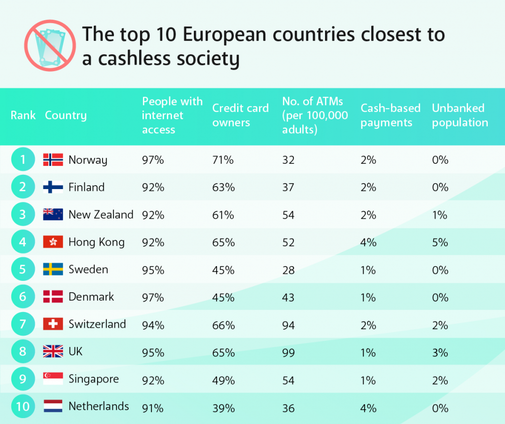 وجاءت النرويج كأعلى دولة استخدامًا للتكنولوجيا في التعاملات المصرفية بنسبة انتشار للإنترنت حوالي 97% وتغطي الخدمات المصرفية كافة المواطنين، بينما سجل التداول النقدي في الدولة 2%، وهي نفس النسبة التي سجلتها فنلندا التي يبلغ نسبة انتشار بطاقات الائتمان فيها 63%.