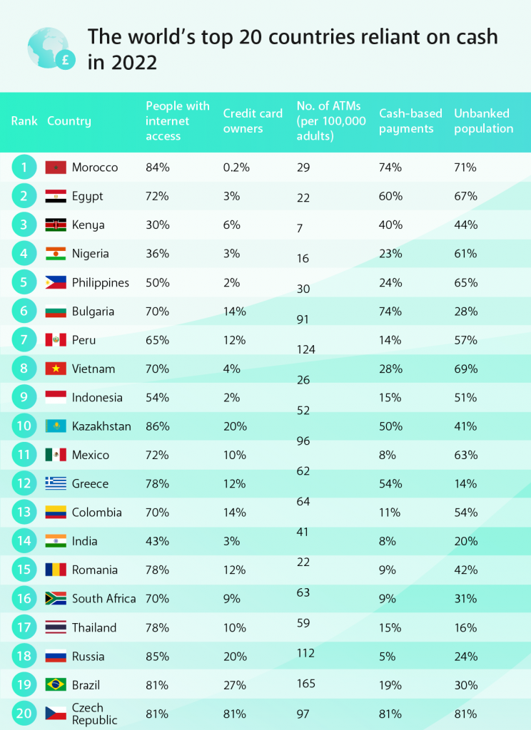 جاءت مصر في المرتبة الثانية على مستوى العالم من حيث أكثر الدول تداولاً للكاش بنسبة معاملات نقيدية أكثر من 60% وفق تقرير Merchant Machine لعام 2022، وفي حين بلغ عدد مستخدمي الإنترنت أكثر من 72% من المواطنين، فإن نسبة انتشار كروت الائتمان لا يتعدى 3%، ونسبة المواطنين غير المشمولين بالخدمات المصرفية حوالي 67%.
