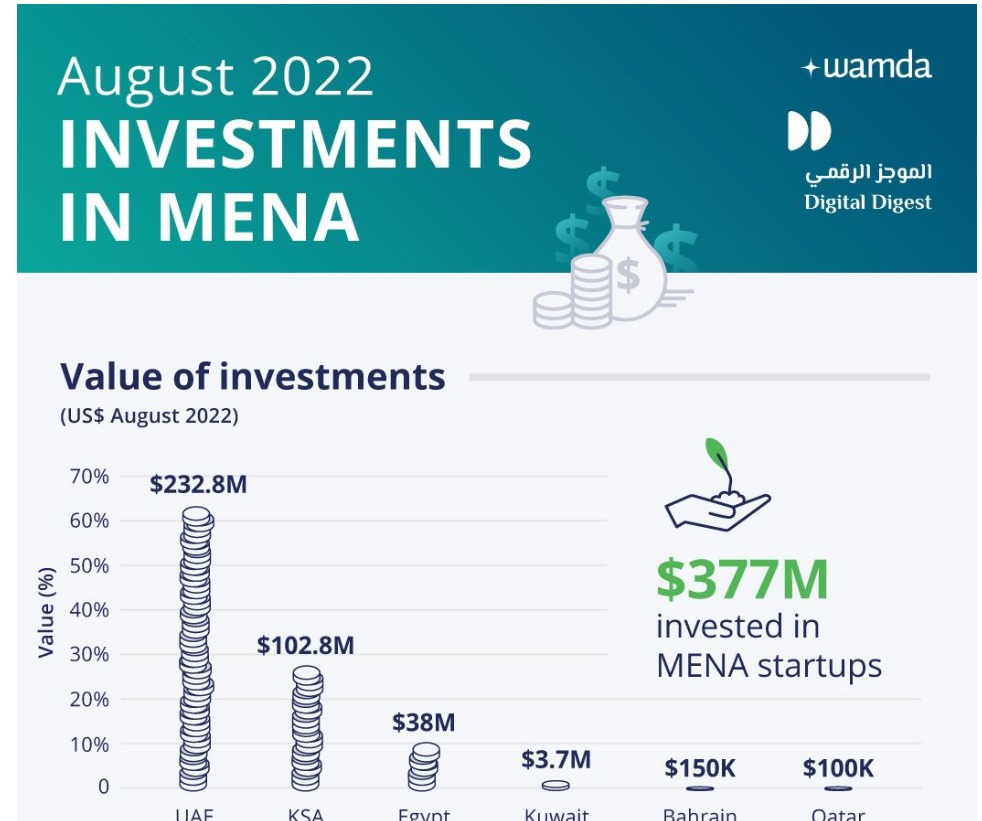 كشف تقرير حديث أن الشركات الناشئة بمنطقة الشرق الأوسط وشمال أفريقيا جذبت استثمارات بقيمة 378 مليون دولار من خلال 33 صفقة في شهر أغسطس الماضي، بزيادة نسبتها 260% على أساس شهري من حيث قيمة التمويل، بينما شهد عدد الصفقات انخفاض نسبي.