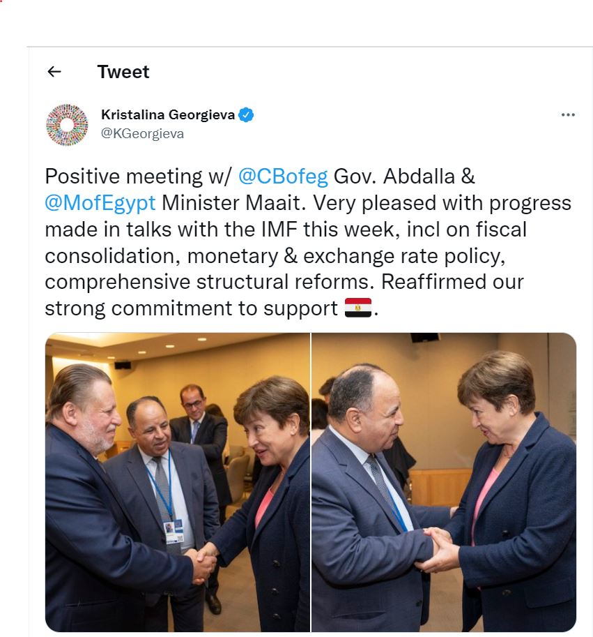 ونشرت كريستينا جيورجيفا، المدير العام لصندوق النقد الدولي، تغريدة على حسابتها على موقع لتواصل “تويتر”، وصورتين أثناء مصافحة حسن عبد الله، محافظ البنك المركزي، ومحمد معيط، وزير المالية.