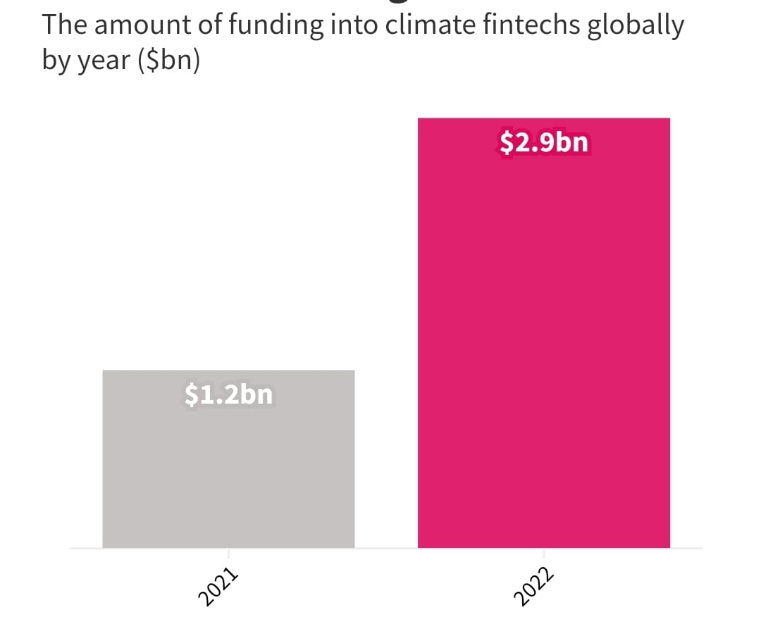 ضخ المستثمرون 2.9 مليار دولار في شركات التكنولوجيا المالية للمناخ على مستوى العالم في عام 2022، وهو رقم قياسي جديد، مرتفعًا من 1.2 مليار دولار في عام 2021، وفقًا لتقرير جديد صادر عن شركة CommerzVentures.