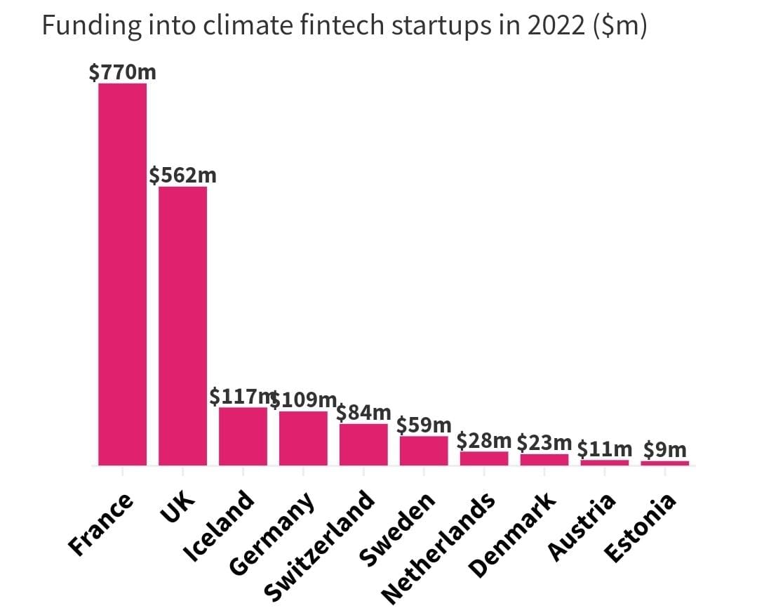 احتلت فرنسا المركز الأول كبلد حصلت شركاتها الناشئة في مجال التكنولوجيا المالية على أكبر قدر من التمويل في أوروبا في عام 2022، ما مجموعه 770 مليون دولار، على الرغم من أن ذلك تم دعمه بشكل كبير من خلال زيادة هائلة لشركة تصنيفات الاستدامة EcoVadis بقيمة 500 مليون دولار في نوفمبر من العام الماضي.