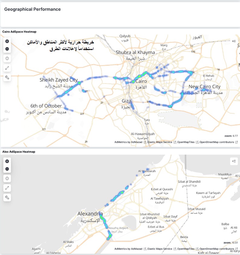 وجاءت في المقدمة منطقة كوبري أكتوبر بحصة 21 % ثم أكتوبر والشيخ زايد بنسبة 20 % ثم شرق القاهرة بـ 14 % والطريق الدائري بـ 11% والمحور بـ 10 % والقاهرة الجديدة بـ 9 %، فيما بلغت الأسكندرية 4 % وغرب القاهرة(الدقي والمهندسين) 3 % وجنوب القاهرة (الكورنيش والمعادي) 3 %. كما يرصد التقرير أيضاً مؤشر قياس مهم يضم قائمة 10 ماركات تستخدم إعلانات الطرق بكل منطقة من المناطق السابقة.
