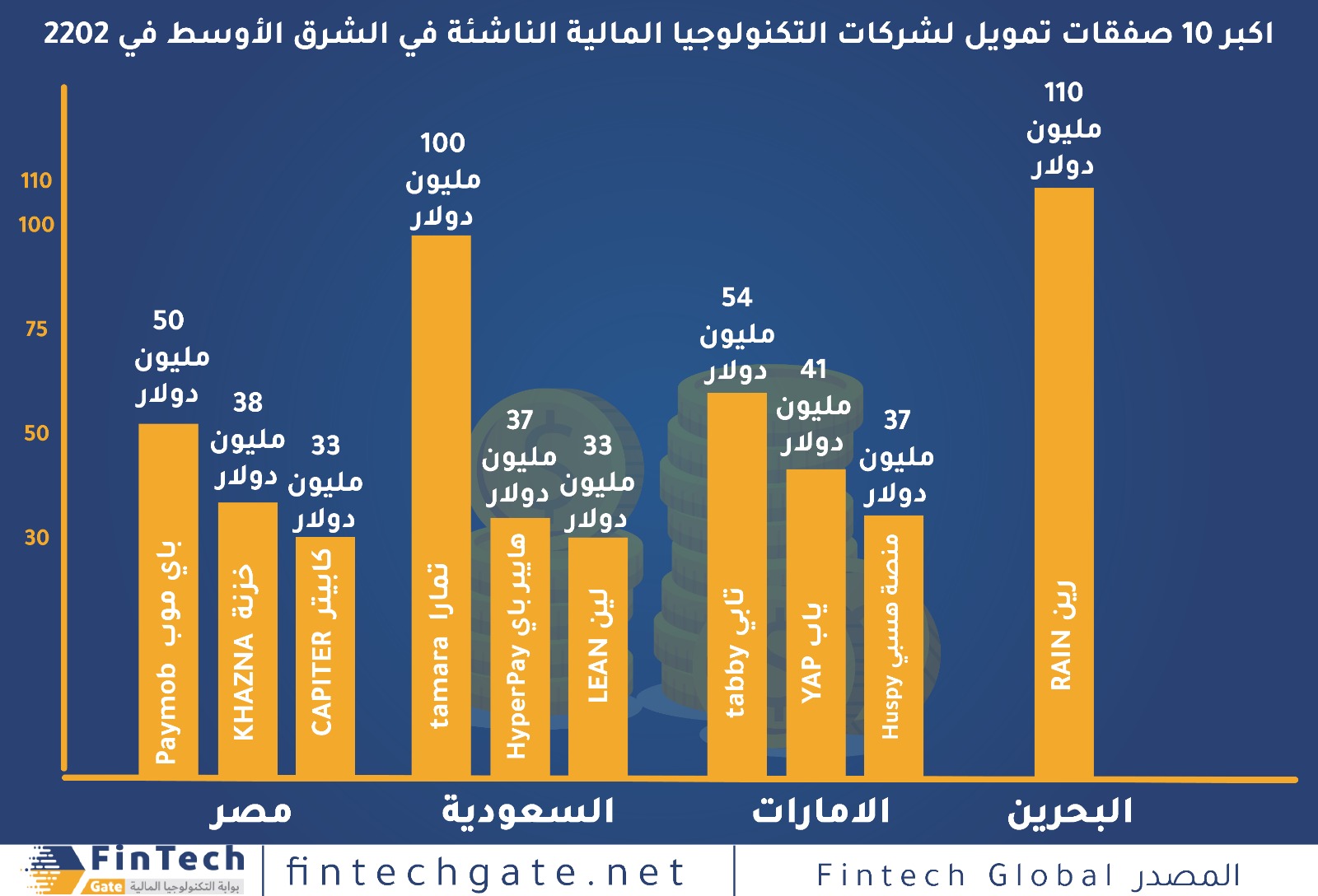 وعلى صعيد أكبر الصفقات التمويلية للشركات الناشئة في مجال التكنولوجيا المالية في منطقة الشرق الاوسط لعام 2022، فقد جاء ترتيبها كالتالي: