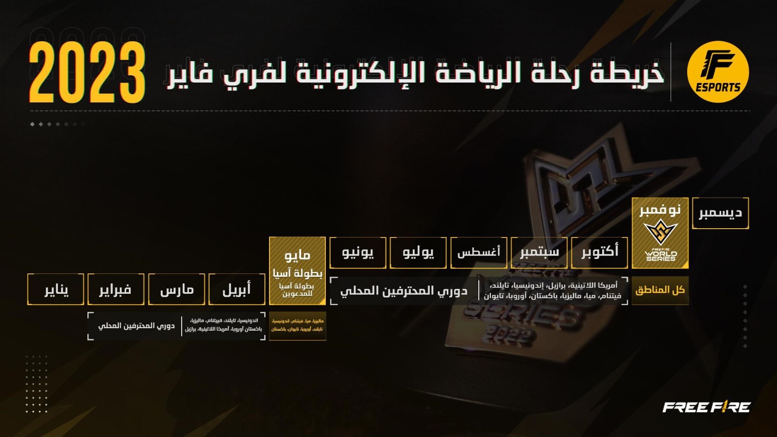 أعلنت شركة جارينا عن خريطة بطولات فري فاير للرياضات الإلكترونية لعام 2023، حيث كشفت عن تحديثات لتنسيق بطولات الرياضات الإلكترونية الدولية، ومن المنتظر أن يتم الإعلان عن النسخة الأولى من Free Fire SEA Invitationals (FFSI) والتي ستبدأ خلال شهر مايو المقبل، وكذلك ميعاد إطلاق بطولة Free Fire World Series ( FFWS) والتي ستقام في نوفمبر المقبل.