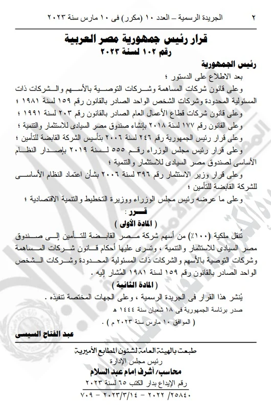الصفحة الرئيسية أخبارالرئيس المصري يصدر قرارا بنقل ملكية الشركة القابضة للتأمين إلى صندوق مصر السيادي