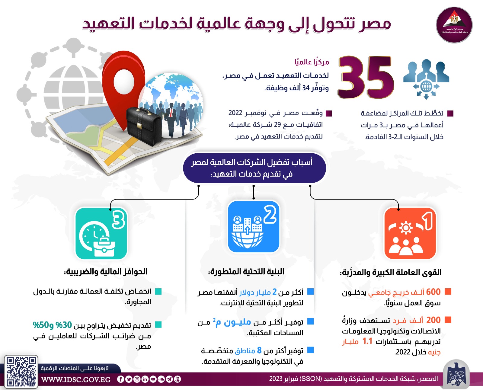 وأضاف أن مصر كانت قد وقَّعت في نوفمبر 2022 اتفاقيات مع 29 شركة عالمية؛ لتقديم خدمات التعهيد في مصرن لافتا إلى أن أسباب تفضيل الشركات العالمية لمصر في تقديم خدمات التعهيد ترجع إلى العديد من العوامل؛ ومنها القوى العاملة الكبيرة والمدرَبة، حيث يضاف 600 ألف خريج جامعي لسوق العمل سنويًّا، بجانب 200 ألف فرد تستهدف وزارة الاتصالات وتكنولوجيا المعلومات تدريبهم باستثمارات 1.1 مليار جنيه.