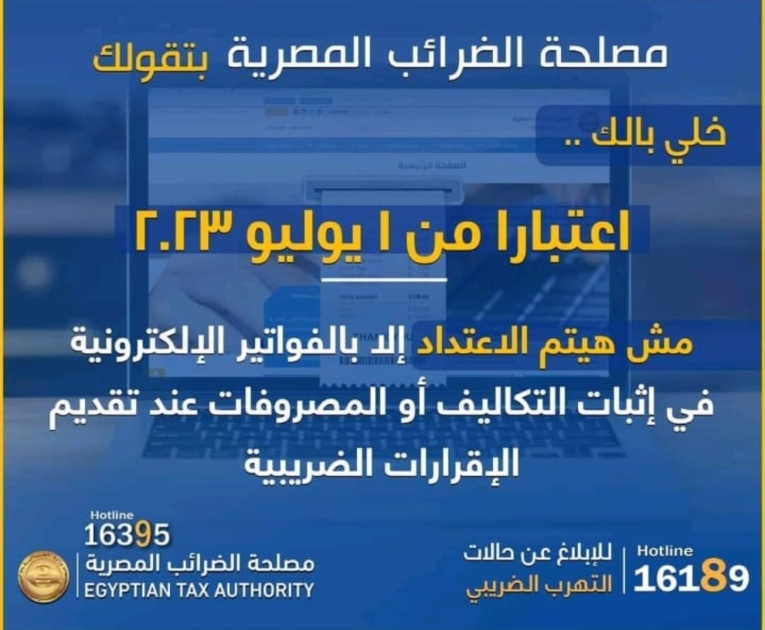 أكدت مصلحة الضرائب المصرية أنه لن يتم الاعتداد إلا بالفواتير الإلكترونية في إثبات التكاليف أو المصروفات عند تقديم الإقرارات الضريبيةوكذلك عند خصم أو رد ضريبة القيمة المضافة، إعتبارا من أول يوليو المقبل.