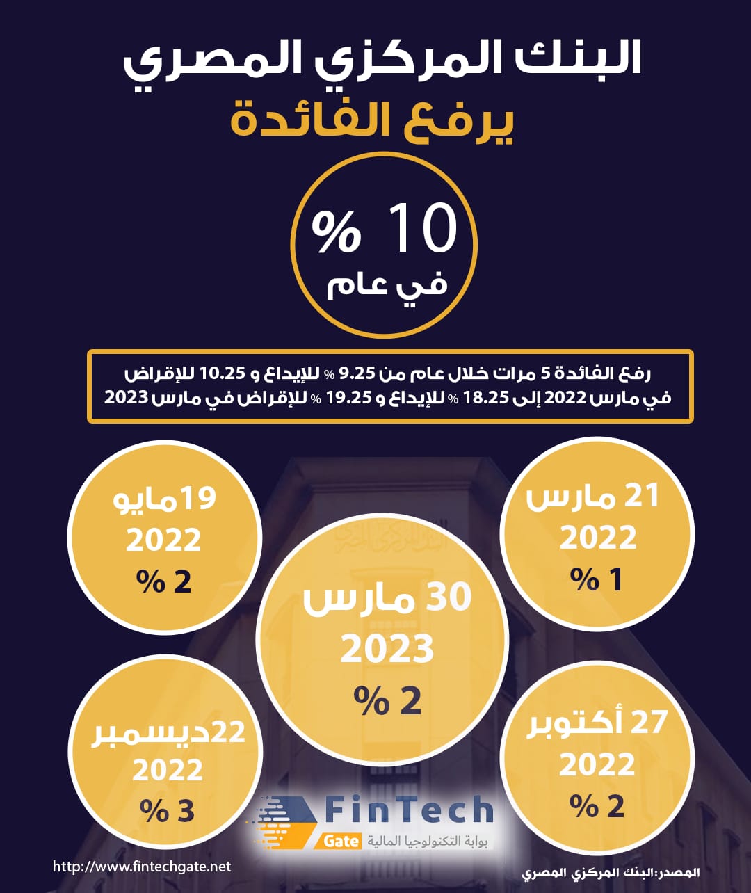 قام البنك المركزي المصري برفع أسعار الفائدة خلال الفترة من 21 مارس 2022 إلى 30 مارس 2023 برفع أسعار الفائدة بنحو 10%.