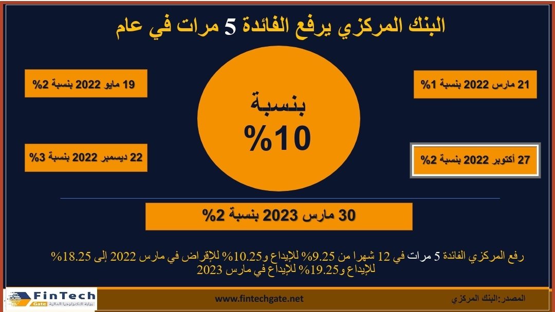 قام البنك المركزي المصري برفع أسعار الفائدة خلال الفترة من 21 مارس 2022 إلى 30 مارس 2023 برفع أسعار الفائدة بنحو 10%.