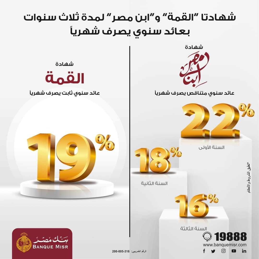قرر بنك مصر اليوم إعادة اصدار شهادة “ابن مصر” لمدة ثلاث سنوات، تصدر شهادة “ابن مصر” بعائد متناقص يبدأ من %22 في السنة الأولى و18% في السنة الثانية و16% في السنة الثالثة ويتم صرف العائد بصورة شهرية. كما قام بنك مصر برفع معدل العائد على شهادة “القمة” والتي تصدر لمدة 3 سنوات بعائد ثابت 19% سنوياً طوال مدة الشهادة ويتم صرف العائد بصورة شهرية.