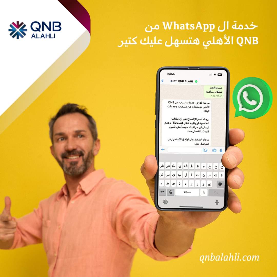أطلق بنك QNB الأهلي خدمة الـ WhatsApp لتسهيل تواصل العملاء مع البنك، وللرد على كافة استفسارات وأسئلة العملاء الخاصة بمنتجات البنك والخدمات البنكية.