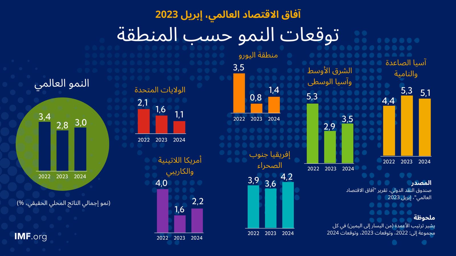 وقدر صندوق النقد الدولي، في تقرير آفاق الاقتصاد العالمي الصادر اليوم على هامش اجتماعات الربيع المنعقدة في العاصمة الأمريكية واشنطن، هبوط نمو الاقتصاد العالمي من 3.4 في المائة في 2022 إلى 2.8 في المائة في 2023، قبل أن يستقر عند 3 في المائة في 2024.