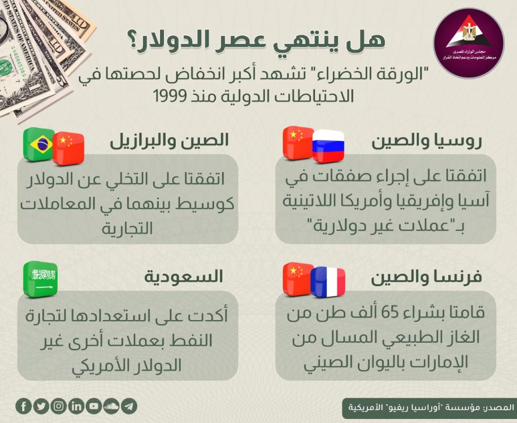 وأوضح الإنفوجراف، أن هناك توقعات بأن تستمر رحلة تراجع حصة الدولار في الاحتياطات الأجنبية العالمية، حال انخفاض نسبة مساهمته في حجم التجارة الدولية، والتي تبلغ حاليًا ٥٠ ٪ من إجمالي المعاملات التجارية العالمية، مشيرًا إلى أن حصة الدولار من الاحتياطات الدولية قد تنخفض إلى ٤٠ ٪ حال انخفاض نسبة مساهمته في التجارة الدولية إلى الثلث بدلاً من النصف حاليًا، بما يشير إلى تأثير استمرار الاعتماد على اليوان الصيني والعملات غير الدولارية الأخرى على هيمنة “الورقة الخضراء” على الاقتصاد العالمي، ونفوذها الذي اكتسبته أعقاب الحرب العالمية الثانية خلفًا للجنيه الاسترليني.