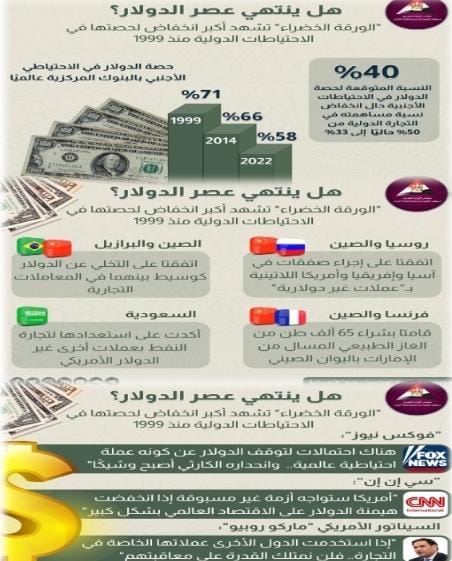 وأشار الإنفوجراف، إلى حجم ما فقدته العملة الدولارية من حصة داخل الاحتياطات الأجنبية بالبنوك المركزية الكبرى، وذلك منذ إطلاق العملة الأوروبية الموحدة “اليورو” في عام ١٩٩٩ وحتى نهاية عام ٢٠٢٢، حيث انخفضت نسبة مساهمته في احتياطات النقد الأجنبي العالمي من ٧١٪ إلى ٥٨ ٪، خلال تلك الفترة.