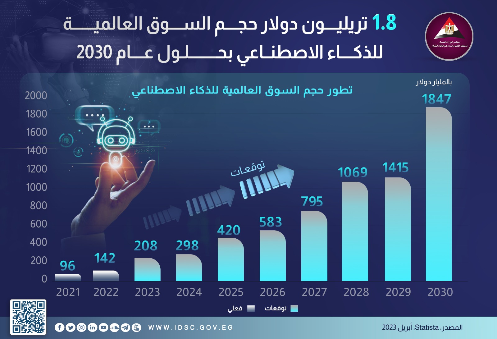 نشر مركز المعلومات ودعم اتخاذ القرار بمجلس الوزراء مجموعة من الإنفوجرافات، بجانب مقطع فيديو، وذلك عبر منصاته الرقمية المختلفة على مواقع التواصل الاجتماعي، حول تقنيات الذكاء الاصطناعي وحجم سوقها العالمي وأهميتها بالنسبة للاقتصاد العالمي والتدفقات الاستثمارية بين الدول، بالإضافة إلى رصد أبرز المخاطر الناتجة عن استخداماتها المتطورة.