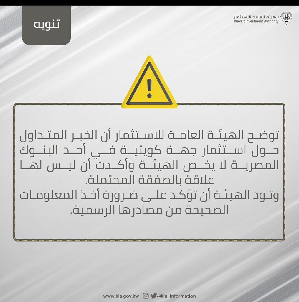 أكدت هيئة الإستثمار الكويتية عدم صحة ما نشر حول إستثمار إحدى الجهات التابعة في أحد البنوك المصرية.