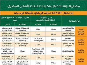 أعلن البنك الأهلي المصري عن رسوم استخدام ماكينات الصراف الآلي سواء الخاصة بالبنك أو ماكينات بنوك أخرى داخل مصر.وأوضح البنك أن بطاقات الخصم المباشر والتي تضم بطاقات الخصم المباشر، وبطاقات الخصم المباشر البلاتينية ،مجانية الرسوم عند استخدام ماكينات البنك الأهلي سواء عند الاستعلام والسحب ،بينما في حالة استخدام ماكينات تابعة لأي بنك آخر ، فتبلغ الرسوم نحو 1.5 جنيه على كل عملية استعلام ،و 5 جنيهات عن كل عملية سحب.