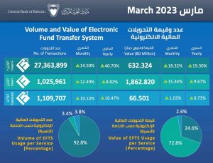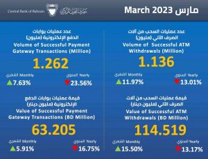 شهدت قيمة عمليات نقاط البيع والتجارة الإلكترونية بالبحرين في شهر مارس الماضي ارتفاعًا على أساس سنوي بنسبة 9.7%، و2.2 % على أساس شهري.