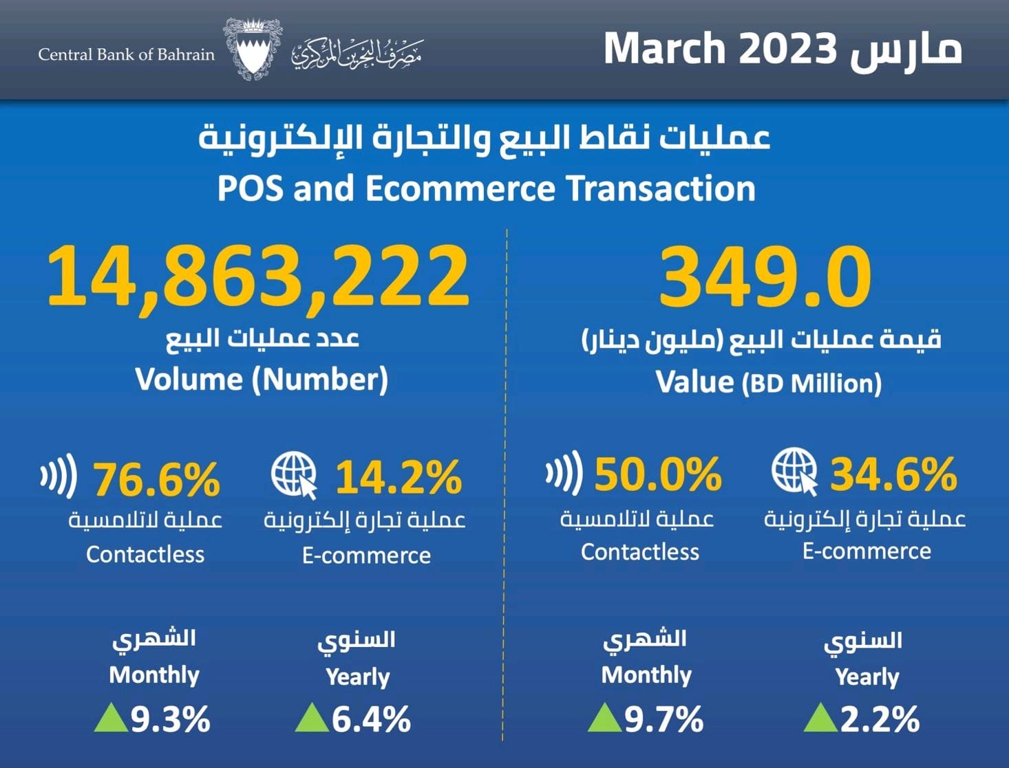 شهدت قيمة عمليات نقاط البيع والتجارة الإلكترونية بالبحرين في شهر مارس الماضي ارتفاعًا على أساس سنوي بنسبة 9.7%، و2.2 % على أساس شهري.