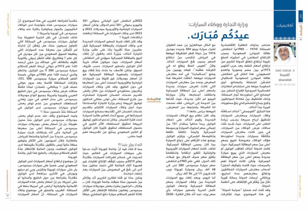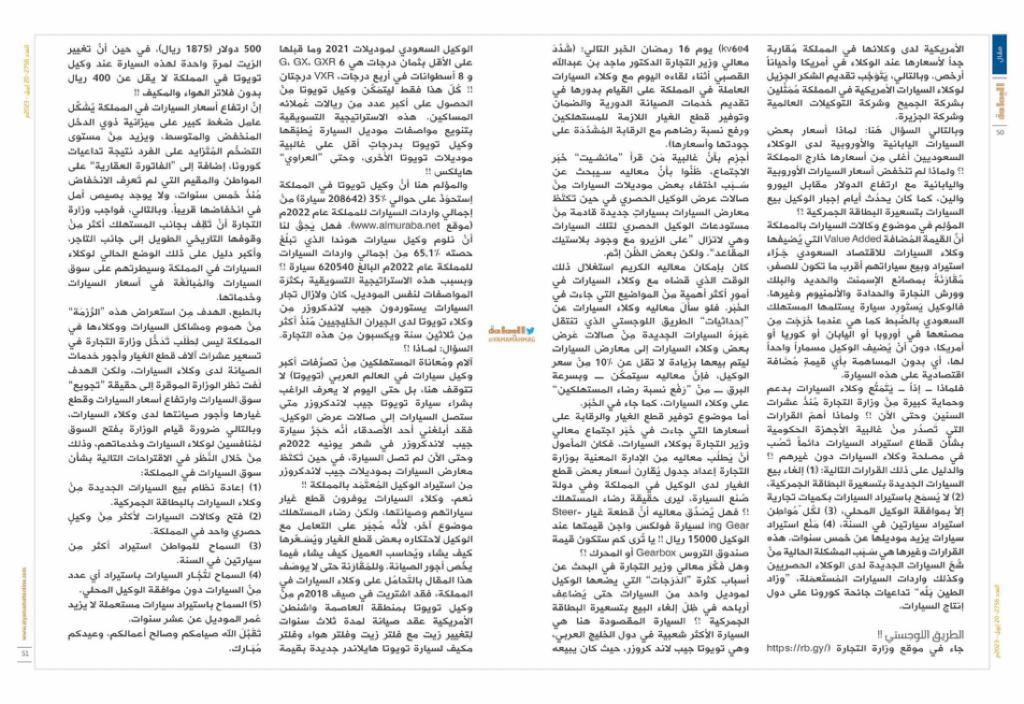 نشرت (مجلة اليمامة) الشهيرة التي تصدر عن مؤسسة اليمامة الصحفية (مقرها الرياض)، وهي واحدة من أعرق المؤسسات الصحافية السعودية، نشرت الخميس 20 إبريل 2023 مقالاً عدهُ مراقبون مهماً فيما يتصل بحقوق المستهلك في المملكة في مواجهة وكلاء وتجار السيارات الجديرة..