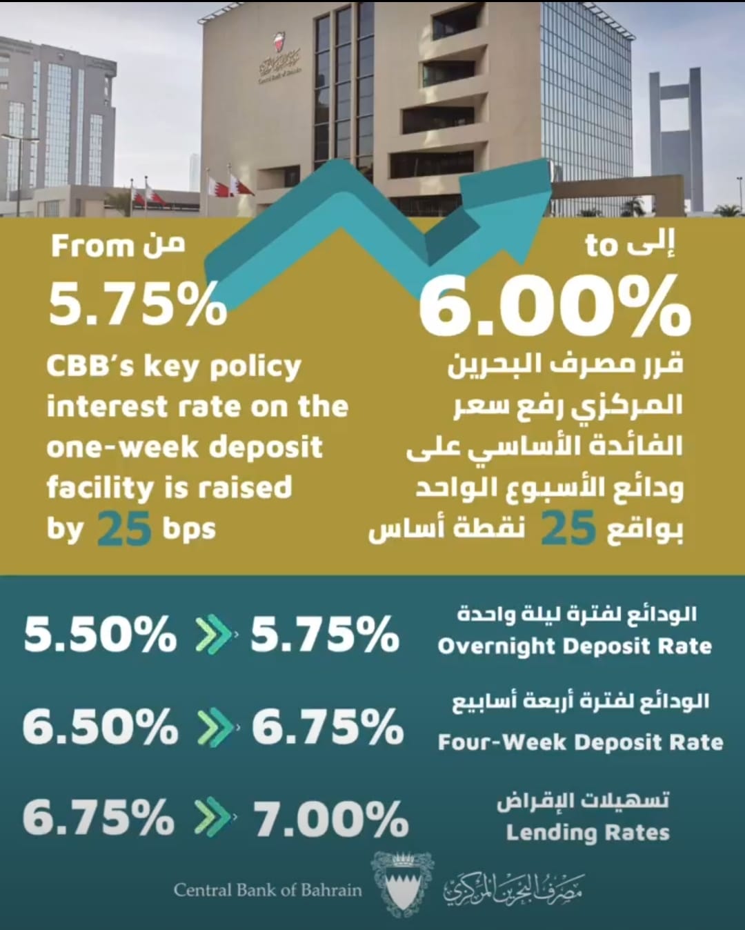 كما قرر مصرف البحرين المركزي رفع سعر الفائدة الأساسي على ودائع الأسبوع الواحد من 5.75% إلى 6.00%، على ضوء التطورات في أسواق المال الدولية، وضمن الاجراءات التي يتخذها المصرف المركزي لضمان انسيابية أداء أسواق النقد في مملكة البحرين.