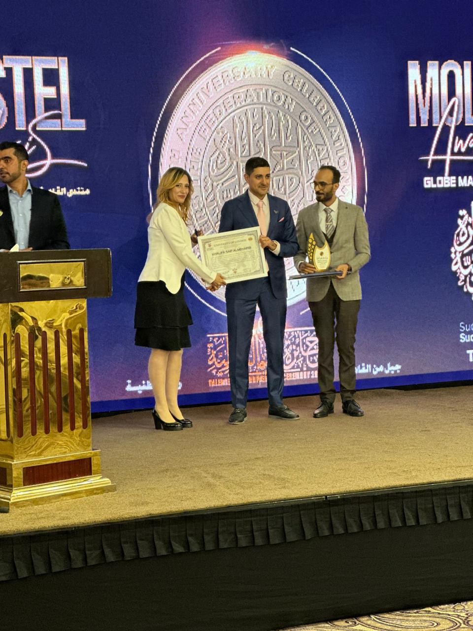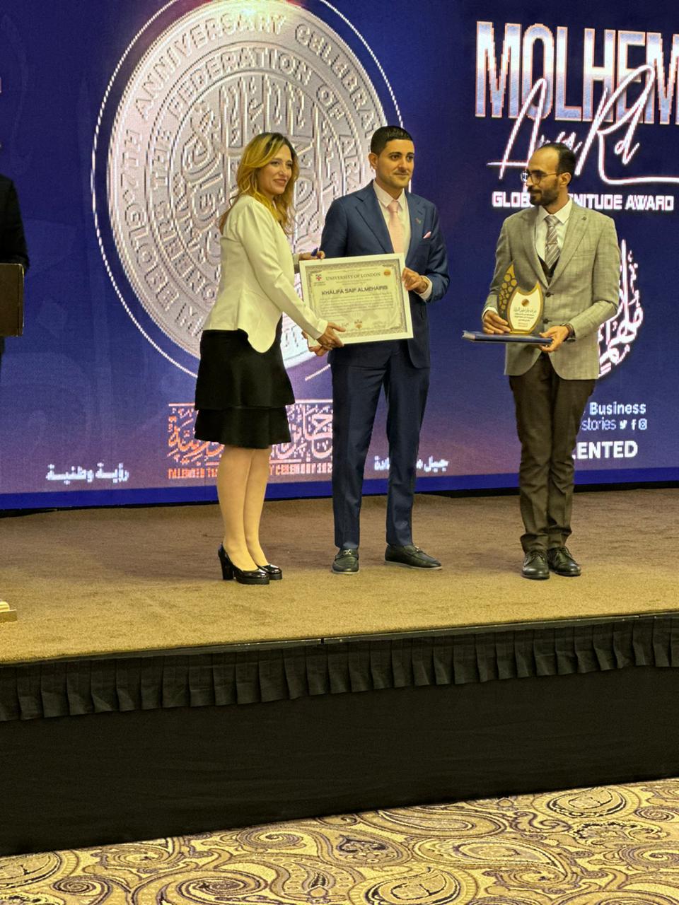 رجل الاعمال الاماراتي خليفة سيف المحيربي رئيس شركة الخليج العربي للاستثمار وعضو مجلس الامارات للمستثمرين في الخارج على شهادة الدكتوراة الفخرية في مجال الاقتصاد الدولي وإدارة الأعمال، وذلك في حفل الدورة السابعة من جائزة ملهم الدولية الذي جرى تنظيمه أمس في العاصمة المصرية القاهرة.