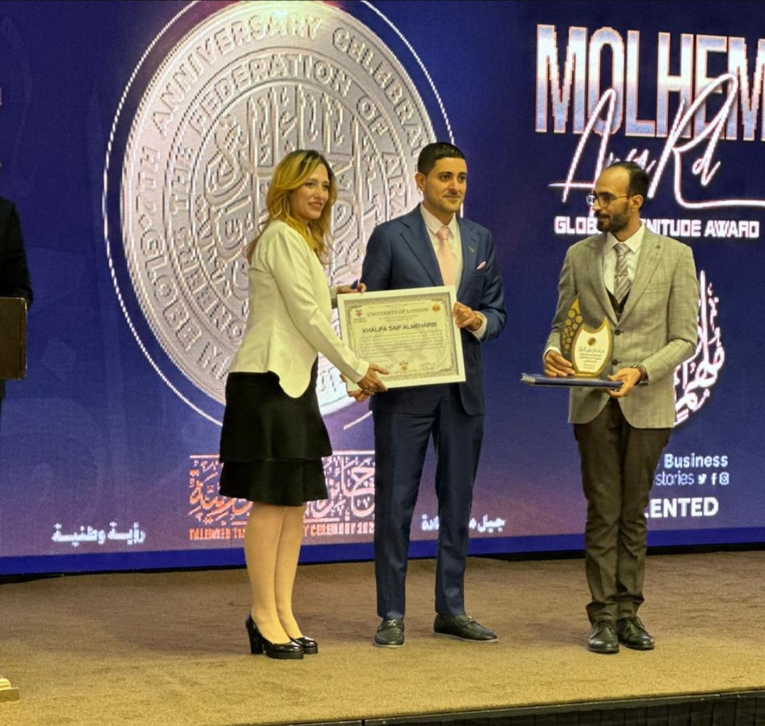 رجل الاعمال الاماراتي خليفة سيف المحيربي رئيس شركة الخليج العربي للاستثمار وعضو مجلس الامارات للمستثمرين في الخارج على شهادة الدكتوراة الفخرية في مجال الاقتصاد الدولي وإدارة الأعمال، وذلك في حفل الدورة السابعة من جائزة ملهم الدولية الذي جرى تنظيمه أمس في العاصمة المصرية القاهرة.