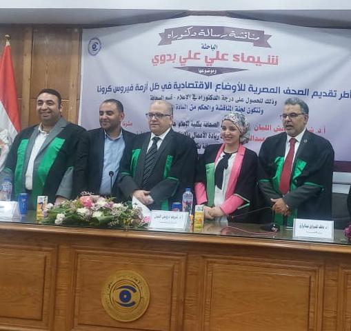 ناقشت كلية الإعلام بجامعة القاهرة أول رسالة دكتوراه مصرية بعنوان” أطر تقديم الصحف المصرية للأوضاع الاقتصادية في ظل أزمة فيروس كورونا”، تكشف عن أطر تقديم الصحف المصرية للوضع الاقتصادي خلال أزمة كورونا، فضلاً عن عرض جهود شركاء التنمية من القطاعين الحكومي والخاص والمجتمع المدني في التصدي للوباء،