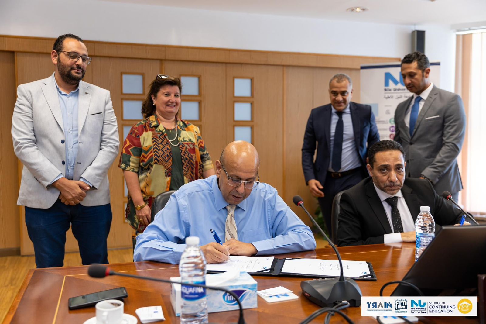 حضر توقيع البروتوكول الذي تم بمقر جامعة النيل الأهلية بمدينة الشيخ زايد، كل من الأستاذ الدكتور وائل عقل رئيس جامعة النيل الأهلية، والدكتورة نيفين عبد الخالق عميد كلية التعليم المستمر بالجامعة والدكتور تامر محمود المدير التنفيذي لشركة ترين للتدريب والدكتورة هبة لبيب المدير التنفيذي لمبادرة رواد النيل والمهندس محمد الكتاتني مدير مركز التميز للتصدير بمبادرة رواد النيل وعدد من أعضاء فريق العمل في كلا الجهتين.