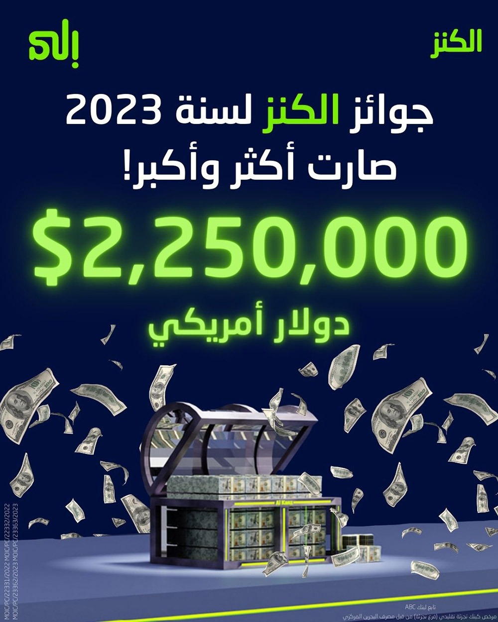 وقال البنك أن جوائز الكنز للعام 2023 توفر فرصًا لعملاء بنك “إلى” للفوز بمبلغ 250 ألف دولار عن شهري مارس وسبتمبر، بالإضافة إلى فرصة الفوز بمبلغ 500 ألف دولار أمريكي عن شهر يونيو، وفرصة للفوز بالجائزة الكبرى بقيمة مليون دولار أمريكي عن شهر ديسمبر.