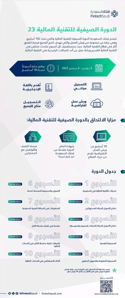 أعلنت فنتيك السعودية عن إنطلاق الدورة الصيفية للتكنولوجيا المالية للعام الحالي 2023 في الرابع من يوليو المقبل وتستمر لمدة 10 أسابيع.