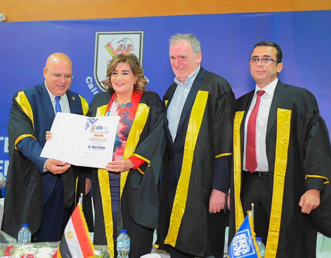 وتم خلال الحفل تكريم الدكتورة نور الزيني رئيس قطاع الإتصال المؤسسي ببنك قناة السويس كمحاضر لمادة الإتصال الرياضي،وسلم التكريم البروفيسور بيير لافرانشي المنسق الأكاديمي للبرنامج على مستوي العالم، الدكتور جمال شحاتة عميد كلية التجارة بجامعة القاهرة، الدكتور عمرو محب ممثل المركز الدولي للدراسات الرياضية CIES بمصر، الدكتور عماد الزمر مدير مركز الدراسات والبحوث التجارية، الدكتور محمد قطب المدير التنفيذي للبرنامج.