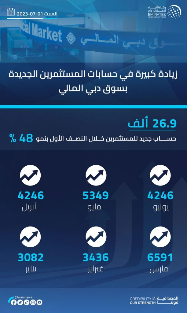 ووفق بيانات سوق دبي المالي سجل عدد الحسابات الجديدة نمواً كبيراً بنسبة قاربت 48 في المائة خلال النصف الأول من العام الحالي، مقارنة بـ 18 ألفا و204 حسابات جديدة خلال النصف الأول من 2022.