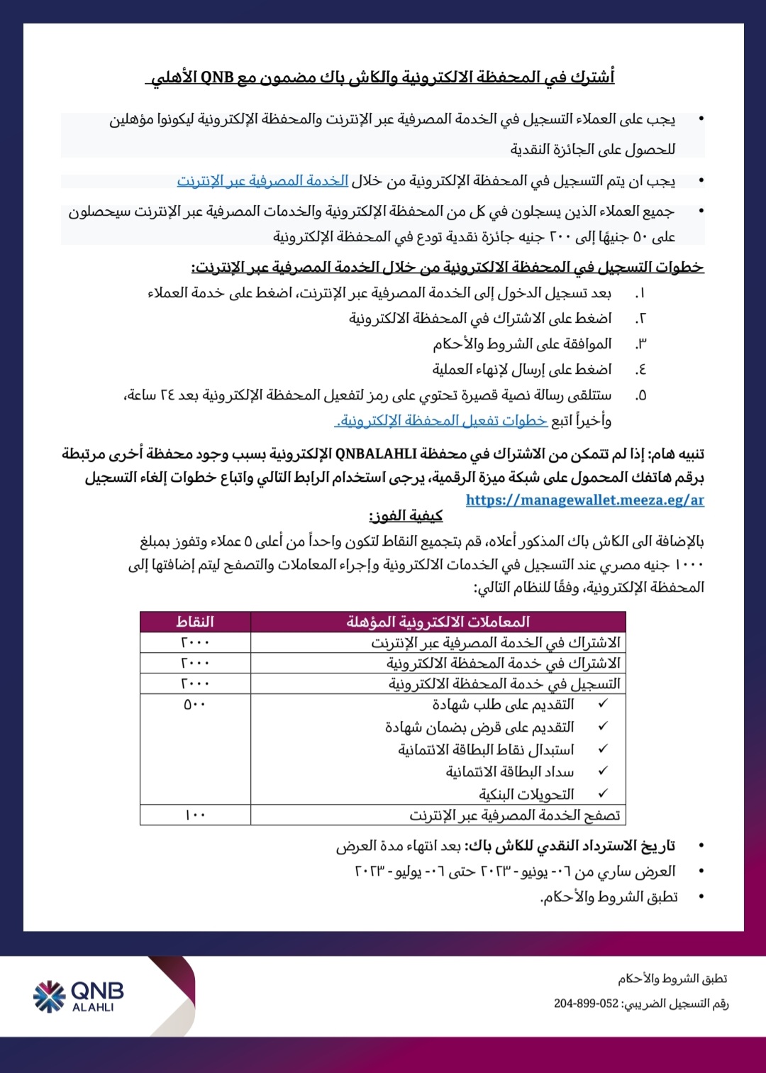 أعلن بنك QNB الأهلي لعملاءه امكانية تسجيل حسابهم في الخدمة المصرفية عبر الانترنت والحصول على كاش باك من المحفظة الالكترونية.