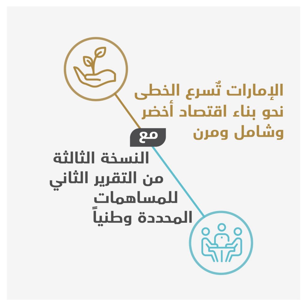 وعقدت دولة الإمارات أكثر من 100 اجتماع ثنائي مع مؤسسات حكومية وخاصة، بالإضافة إلى تنظيم ورش عمل مخصصة وخلق أكثر من 110 فرصة أمام أصحاب المصلحة للمشاركة في العملية، وأثمر ذلك عن نحو 800 وثيقة تغذية راجعة. وأخذت وزارة التغير المناخي والبيئة مخرجات تلك الأنشطة جميعها في الاعتبار عند إعداد النسخة الثالثة من التقرير الثاني للمساهمات المحددة وطنياً لدولة الإمارات. كما راعت الدولة خلال تلك العملية احتياجات فئات الشباب والنساء والأطفال وأصحاب الهمم.